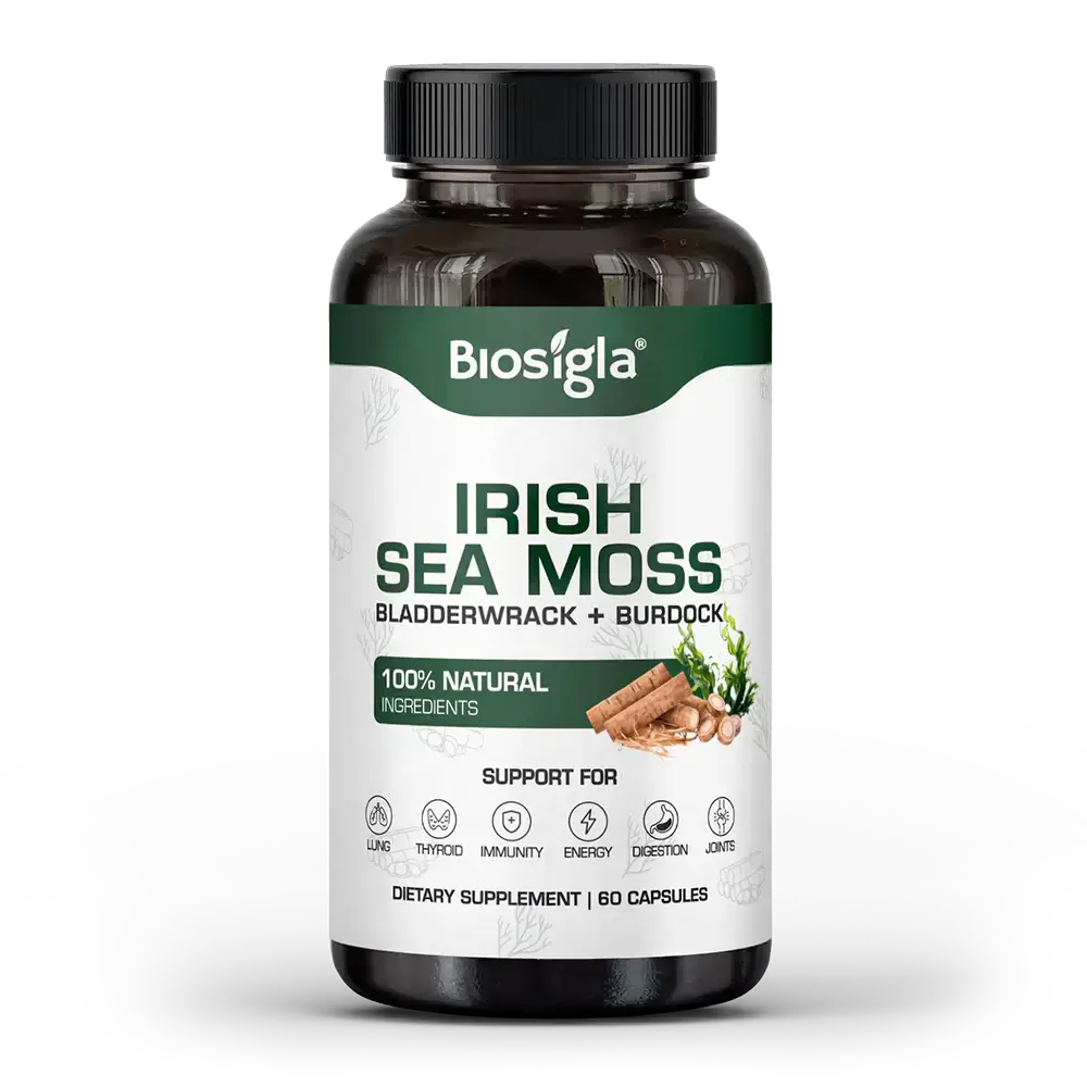 - Biosigla – Irish Sea Moss - Silné zdravie srdca a krvný obeh - Bylinné kapsuly – fľaša s 60 vegetariánskymi kapsulami.