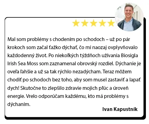 Mal som problémy s chodením po schodoch – už po pár krokoch som začal ťažko dýchať a to mi naozaj ovplyvňovalo každodenný život. Po niekoľkých týždňoch používania Biosigla Irish Sea Moss som zaznamenal obrovský rozdiel. Dýchanie je oveľa ľahšie a už sa tak rýchlo nezadýcham. Teraz môžem chodiť po schodoch bez toho, aby som sa musela zastavovať a lapať dych! Naozaj to zlepšilo zdravie mojich pľúc a úroveň energie. Vrelo odporúčam každému, kto má problémy s dýchaním.